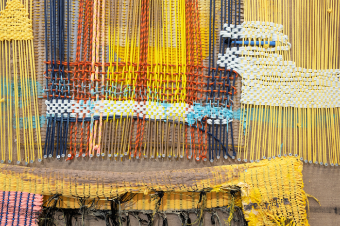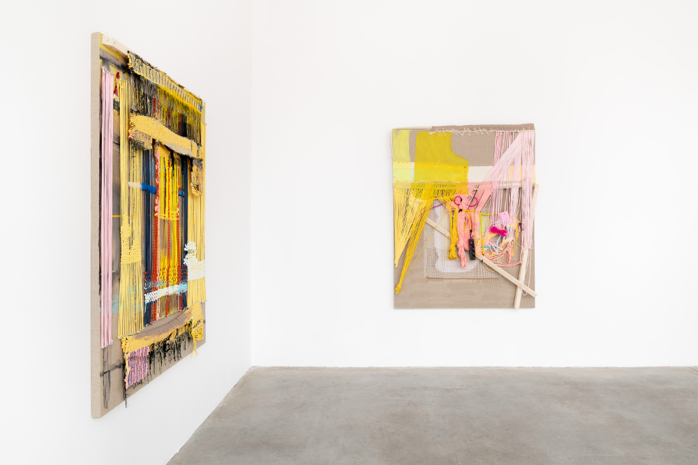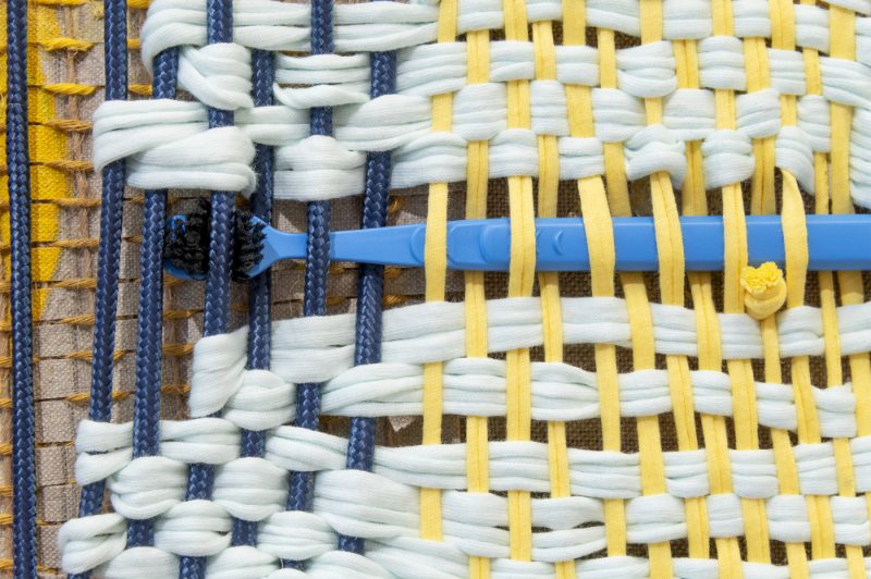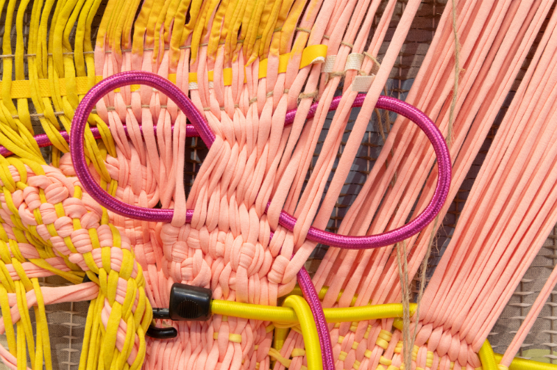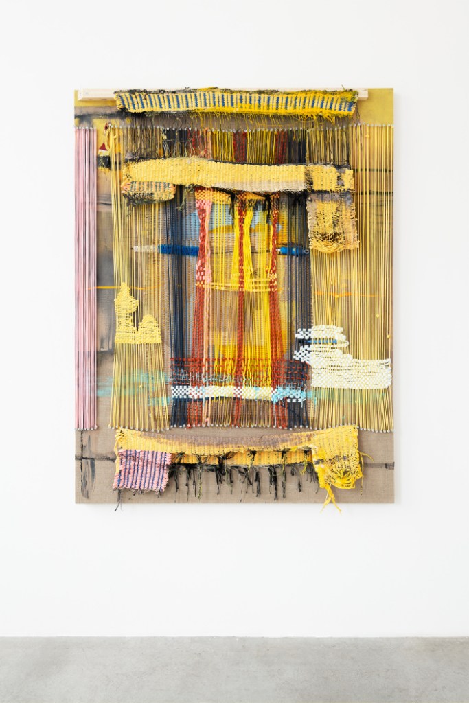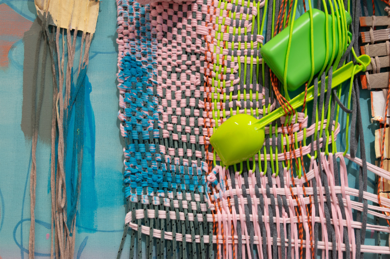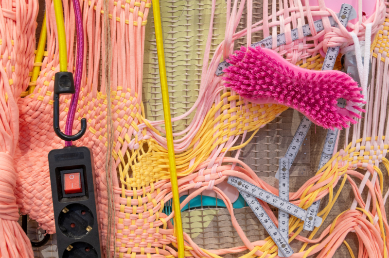 For Aho, the drive to make work is not so much to create a different world, but rather to tame the monsters that the current world (or, also, we ourselves) inhabit. On large canvases, partially painted, she mounts woven patches in threads of different colors, also including objects such as a paintbrush, a toothbrush, a socket strip, or straps used to secure luggage, all tied together in an abstract composition. Τhe first impression is that of a painting on the wall, but Aho also considers painting an open field that can develop into three-dimensional or sculptural pieces. Where traditionally the canvas functions as a neutral support upon which the paint performs the main role, here the very fabric and its structure become a motif and compositional element. More than the brushwork, it is the weaving that creates the signature. Some woven areas are tight and organized, while others contain a lot of loose ends, looking like a messy haircut. The artist seems to be searching for a balance between elements that are solely formal and painterly, and ingredients that have a concrete relationship with her everyday surroundings. Making art is about connecting the abstract world of form with the practical, physical facts of life.